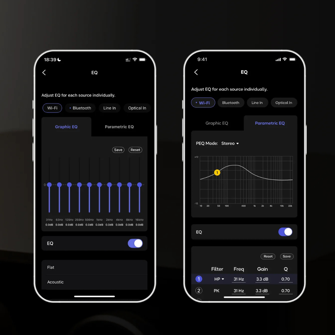 EQ Customization | Input-specific EQ (Wi-Fi, HDMI ARC, Optical, Bluetooth, Line-In); 24 preset EQ profiles; 10-band Graphic & Parametric EQ; RoomFit acoustic tuning |