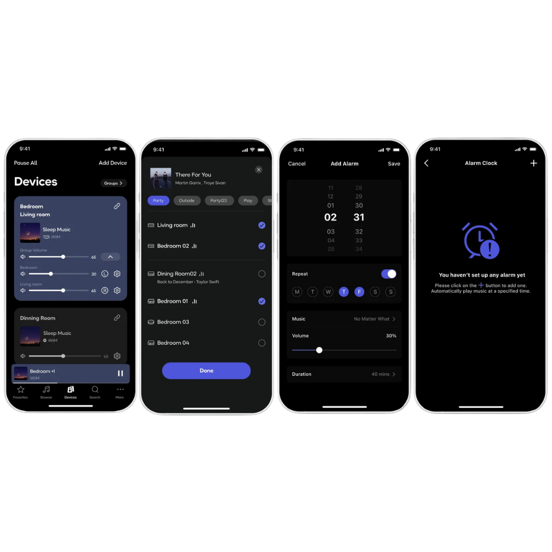 One app. Total control.Stream music, adjust EQ, group rooms, set alarms, or update firmware with ease—right from your phone or tablet.