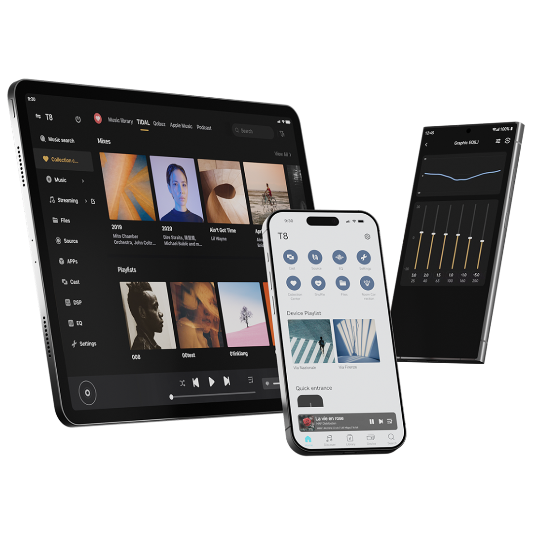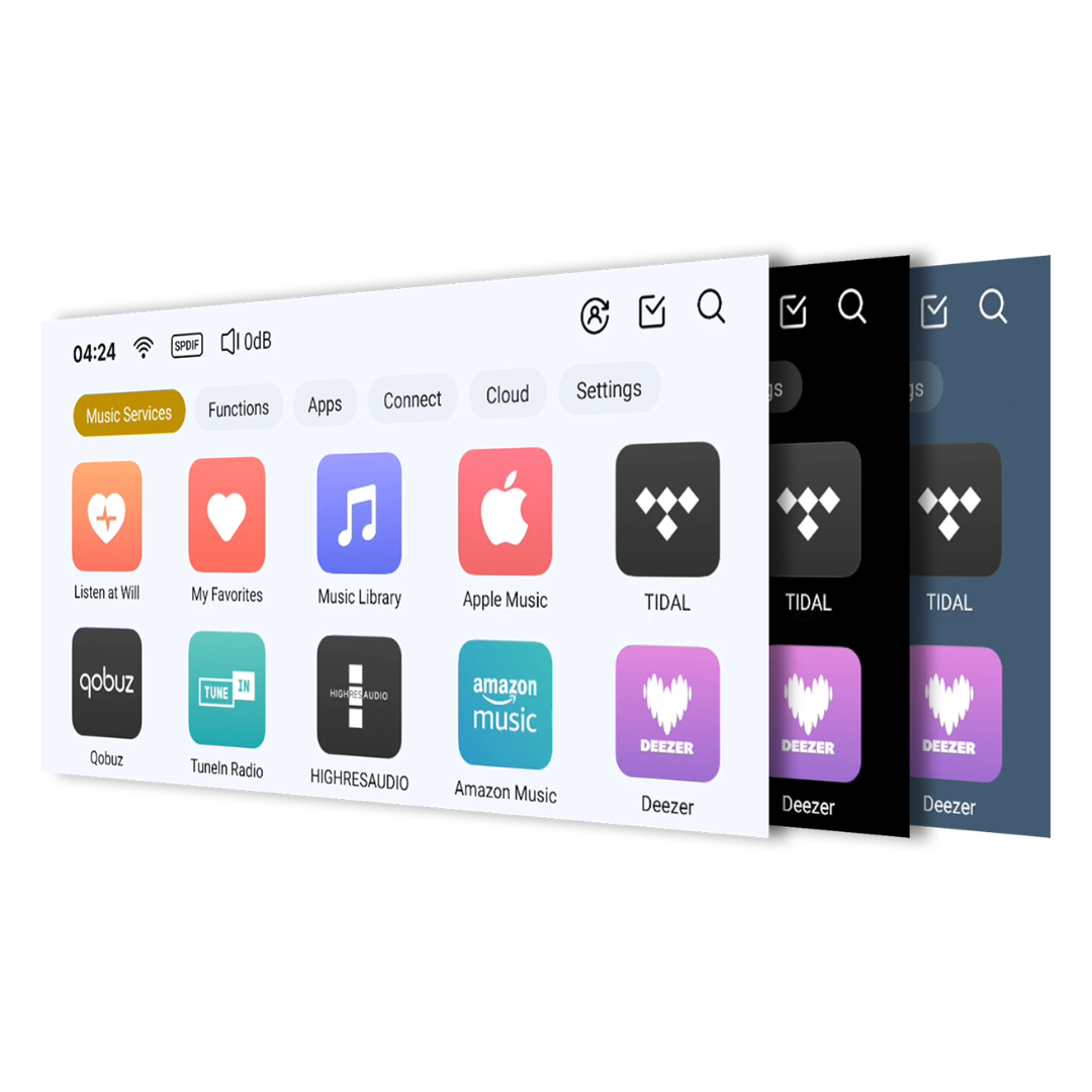 Built-in support for mainstream global music services, deeply integrated with TIDAL, Qobuz, IDAGIO, Amazon Music, TuneIn Radio, Presto Music, KKBOX, Radio Paradise, Deezer, and more. With T8, your life is always accompanied by the world’s pristine sound. Eversolo works seamlessly with these streaming services to deliver a system-level experience. No third-party apps needed—built-in native APIs ensure the highest quality playback.