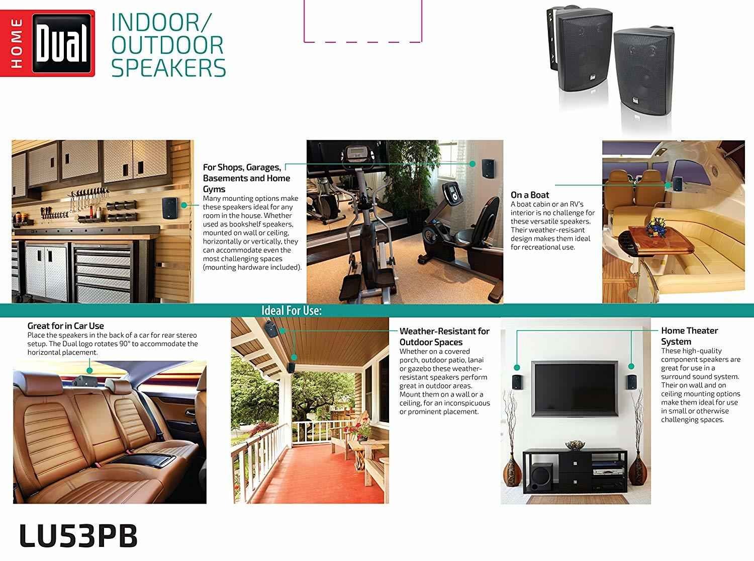 Making sure you were able to place your indoor outdoor speakers in your most desired location we added easy install swivel brackets that allow up to 120 degree range of motion while the front facing Dual logo can rotate up to 90 degrees. Ensuring easy placement and focused sound quality where you want it.